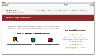 Modal Survey is a Premium WordPress Plugin to get your visitors voice through an attention-grabber poll. Provides a lot of customization options including unlimited surveys, questions and answers with animated display. It has an ability to offer a link at the end of survey, thus much more users will fill out the poll. Also has an option to lock the screen with a dark background. With this solution, the visitors only see the website content after they answered for all questions. It has a detailed documentation, provides premium support with constant updates.